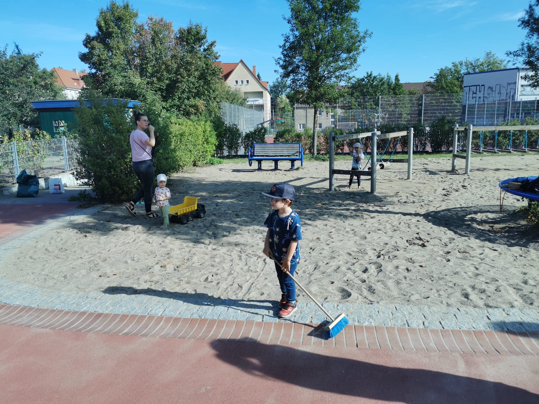 Durch den Kontakt eines Vaters zum Rostocker Grünamt wurden wieder Greifer, Harken, Besen und Schaufeln sowie Müllsäcke zur Verfügung gestellt.
