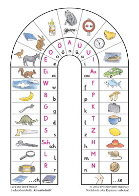 Hierzu eignet sich als Schreibinstrument eine Buchstabentabelle. Wir haben die von Jürgen Reichen ausgewählt. In den ersten Tagen lernt ihr Kind die Bilder und die Buchstaben, mit dem der Name des Bildes beginnt, spielerisch kennen.